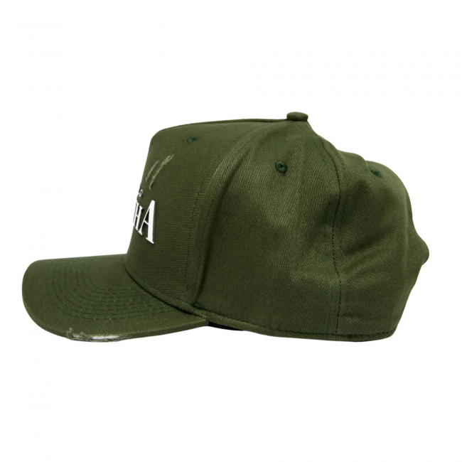 Boné modelo My Best Melody. Na cor Verde Oliva Escuro e com detalhes da logomarca do Rancho Nhazinha. Feixe traseiro estilo snapback (possui um ajuste do plástico, onde você consegue regular o diâmetro do boné através dos furinhos).