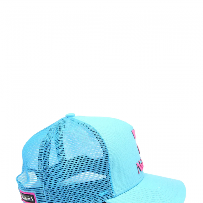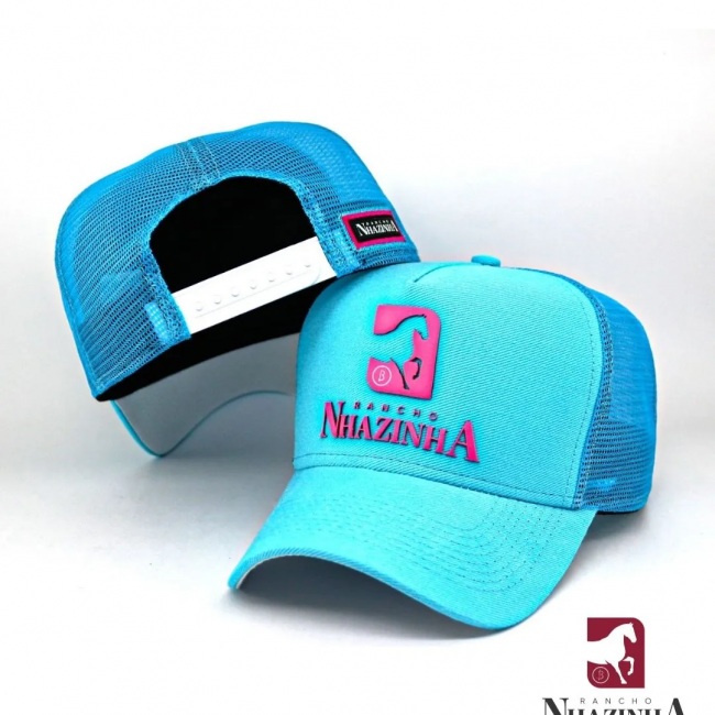 Boné snapback trucker (possui um ajuste do plástico, onde você consegue regular o diâmetro do boné através dos furinhos) na cor tiffany atrás com redinha de nylon e detalhes da logomarca do Rancho Nhazinha.