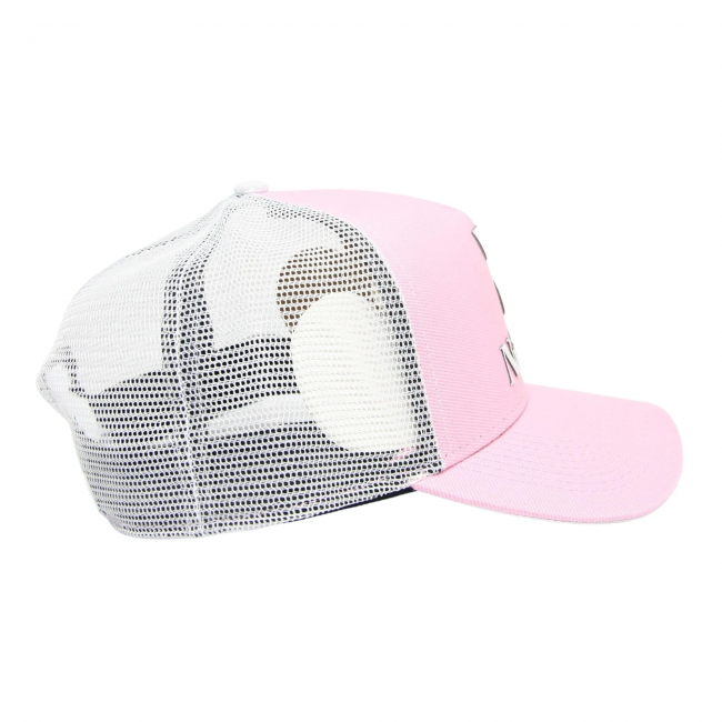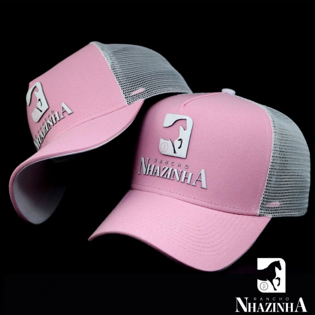 Boné modelo Gunna Pep. Composto com a cor rosa frontal e atrás redinha de nylon branca. Detalhes da logomarca do Rancho Nhazinha.