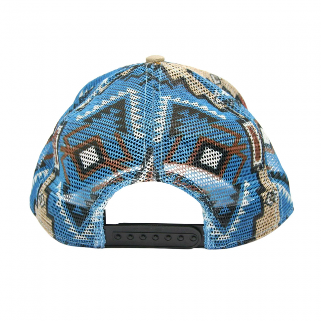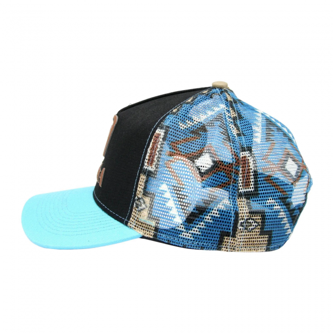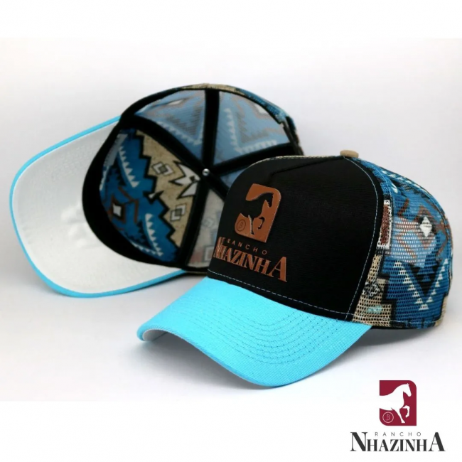 Boné modelo Miss Lena Cat. Composto com a cor preta frontal e azul navarro (estampa étnica ou tribal, onde cores, traços, geometria se misturam).