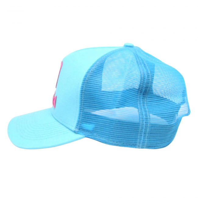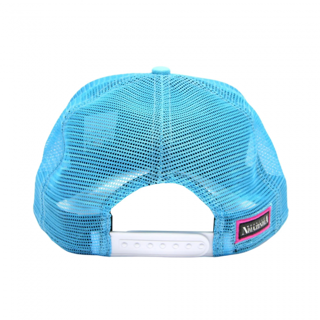 Boné snapback trucker (possui um ajuste do plástico, onde você consegue regular o diâmetro do boné através dos furinhos) na cor tiffany atrás com redinha de nylon e detalhes da logomarca do Rancho Nhazinha.