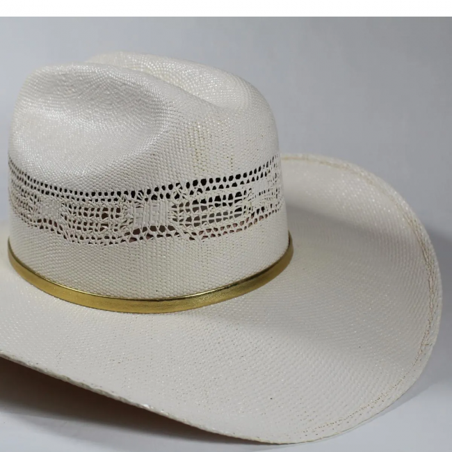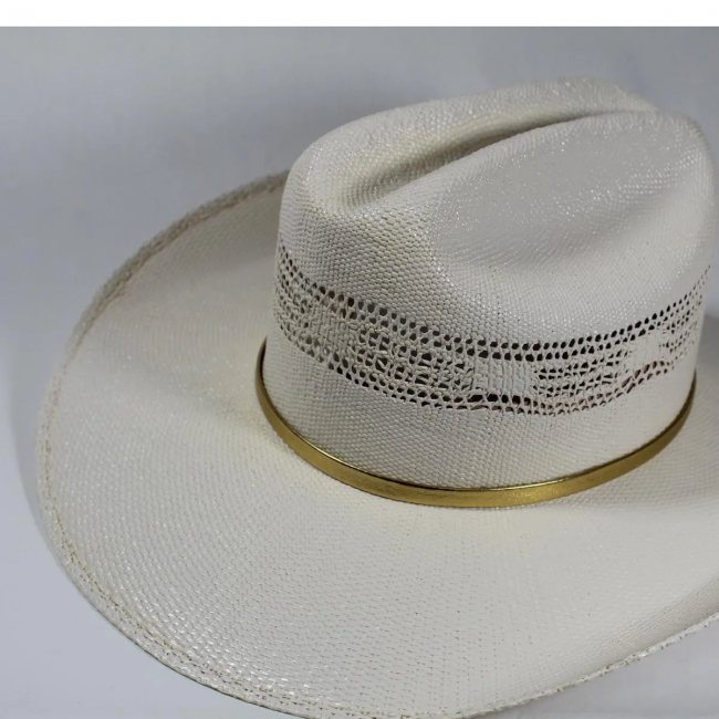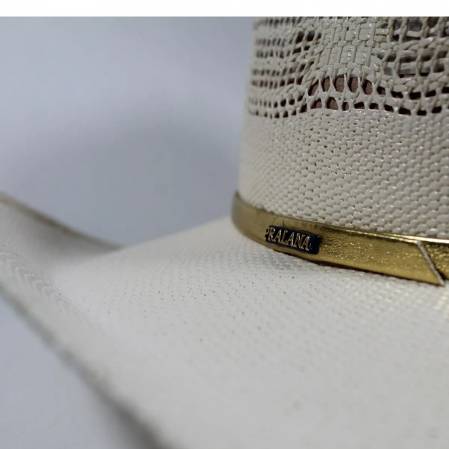 Fabricado com fibras de celulose estilo palha na cor Natural,possui aba de aproximadamente 10cm de largura e copa de 11cm de altura ventilada, o diferencial deste modelo está na bandinha de fitilho dourado, e o acabamento interno é feito com carneira de material sintético.