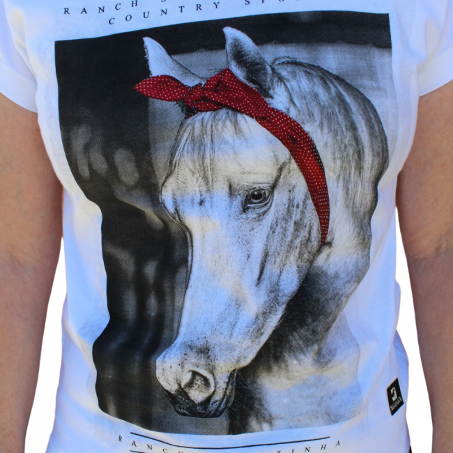 Pensando nas caubóis que admiram a moda country, a camiseta foi desenvolvida para deixar seu look ainda mais temático com seu hobbie. A estampa é feita na imagem de caubóis montados em seus cavalos, praticando as atividades corriqueiras no interior.