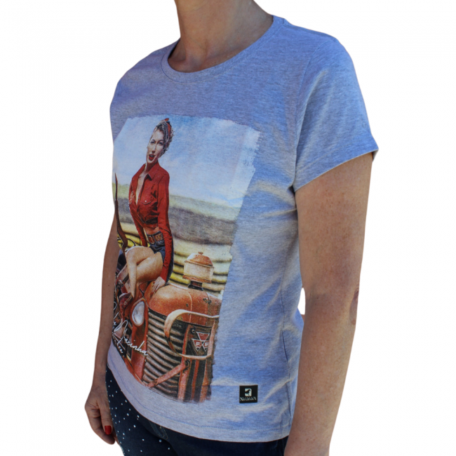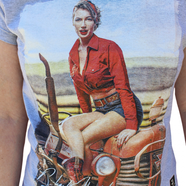 Pensando nas caubóis que admiram a moda country, a camiseta foi desenvolvida para deixar seu look ainda mais temático com seu hobbie. A estampa é feita na imagem de caubóis montados em seus cavalos, praticando as atividades corriqueiras no interior.