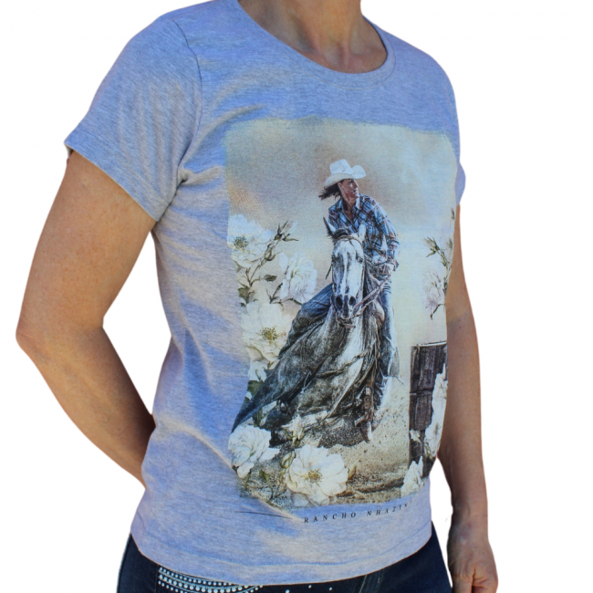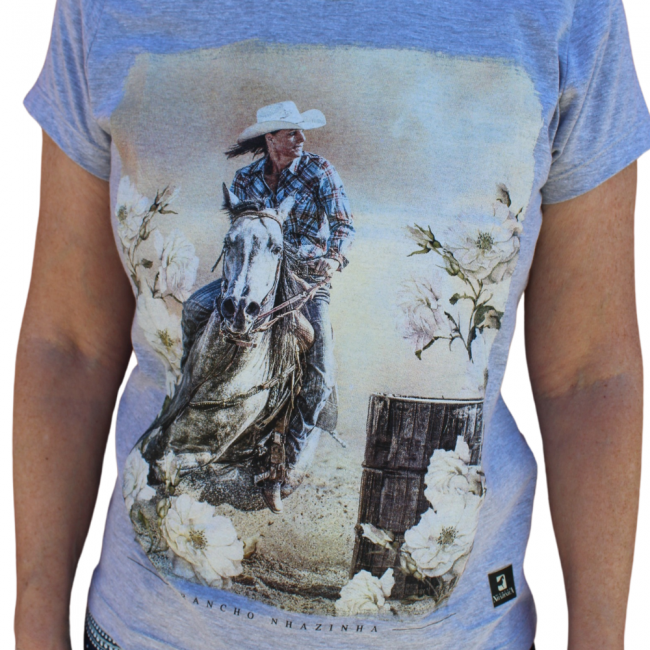 Pensando nas caubóis que admiram a moda country, a camiseta foi desenvolvida para deixar seu look ainda mais temático com seu hobbie. A estampa é feita na imagem de caubóis montados em seus cavalos, praticando as atividades corriqueiras no interior.