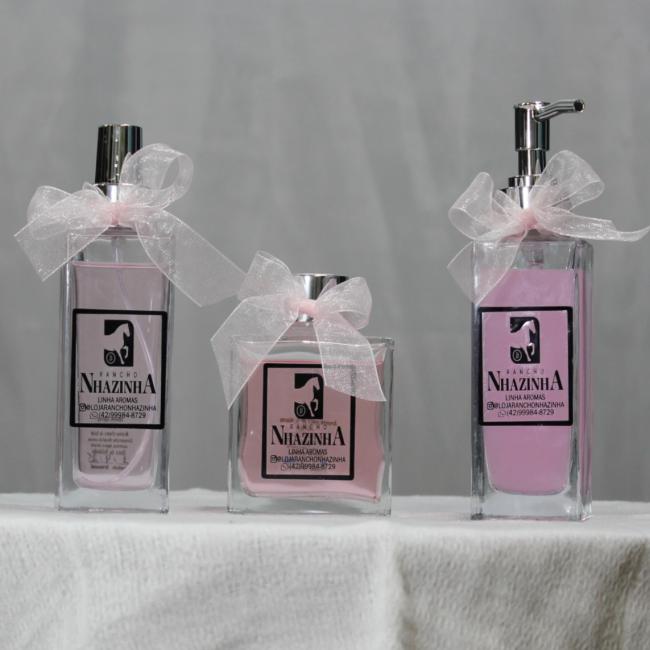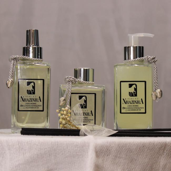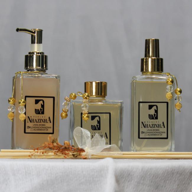 Kit com Aromatizador de ambiente, sabonete líquido e home spray embalagem de vidro com 250ml cada, acompanha varetas para o aromatizador, com valvula pump em metal para o sabonete e valvula spray em metal para o home spray.